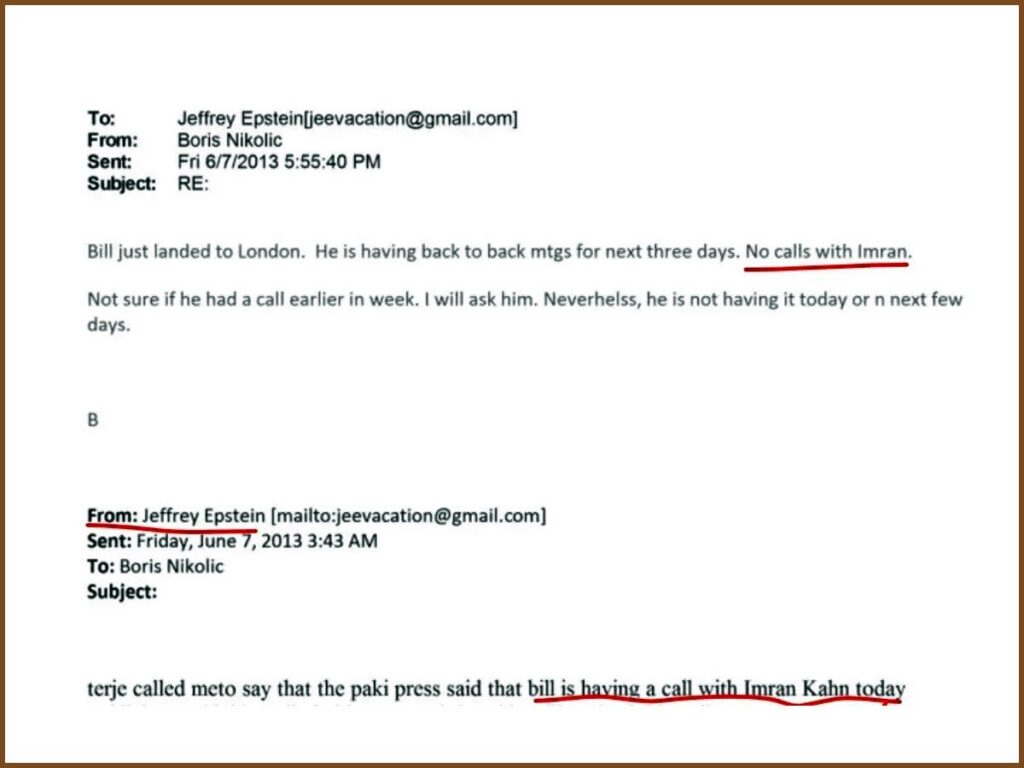 میڈیا رپورٹس کے مطابق بورس نیکولک اور جیفری ایپسٹین کے درمیان ہونے والی ایک ای میل میں اس بات کی نشاندہی کی گئی ہے کہ بل گیٹس پاکستانی میڈیا میں شائع ہونے والی اس خبر پر خوش نہیں تھے جس میں عمران خان سے فون پر ممکنہ گفتگو کا ذکر کیا گیا تھا ، رپورٹ کے مطابق خدشہ ظاہر کیا گیا تھا کہ اس قسم کی خبریں پولیو مہم کے لیے مشکلات پیدا کر سکتی ہیں۔