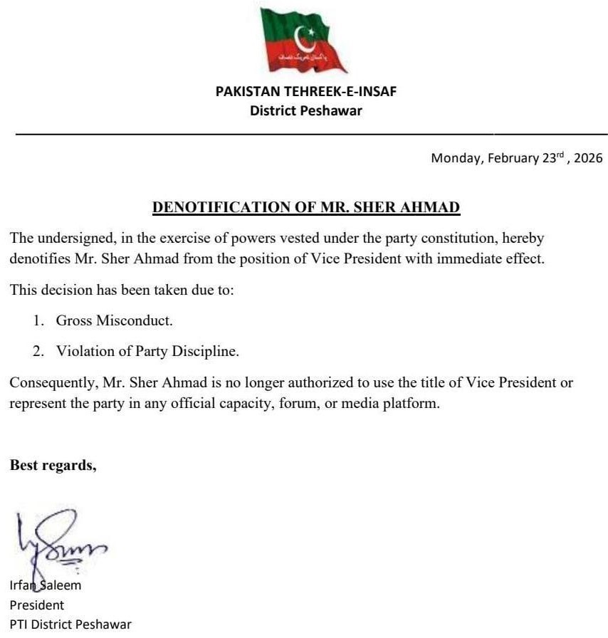 پی ٹی آئی ضلع پشاور کی جانب سے جاری اعلامیے کے مطابق ضلعی نائب صدر شیر احمد کو پارٹی ڈسپلن کی خلاف ورزی پر عہدے سے ہٹا دیا گیا ہے۔ اعلامیے میں کہا گیا ہے کہ یہ فیصلہ ضلعی صدر عرفان سلیم کی جانب سے کیا گیا اور اس کا اطلاق فوری طور پر ہوگا۔