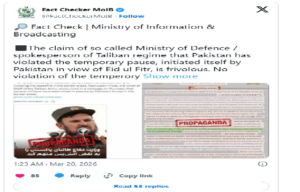 بیان میں مزید کہا گیا کہ اس نوعیت کا پروپیگنڈا ممکنہ طور پر افغان طالبان حکومت کے اندر موجود بعض عناصر کی جانب سے پھیلایا جا رہا ہے، جس کا مقصد خطے میں کشیدگی کو ہوا دینا اور دہشت گردی کے لیے جھوٹا جواز پیدا کرنا ہو سکتا ہے۔