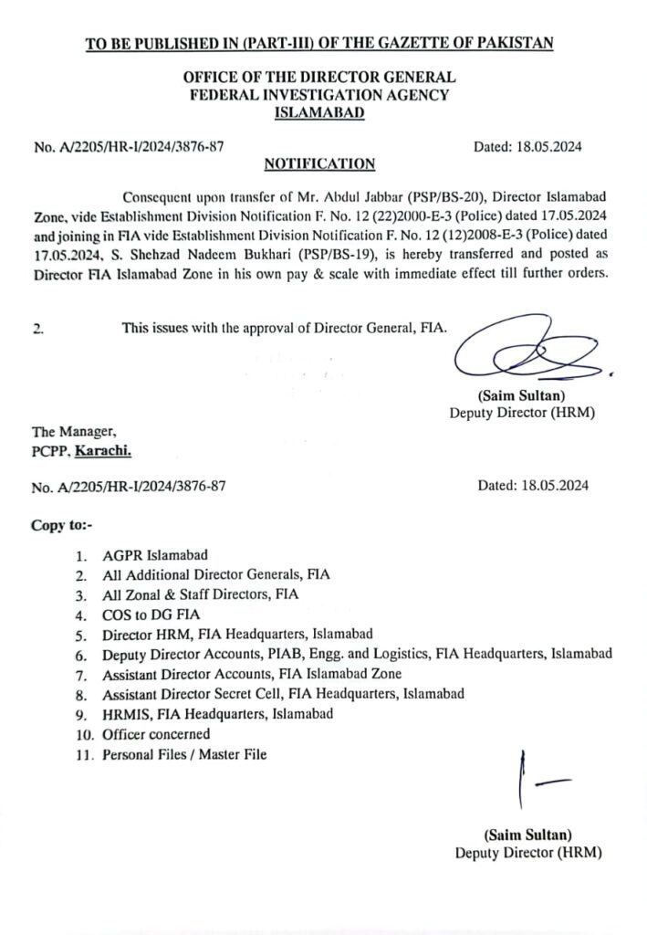 اسلام آباد پوليس ميں بطور ڈی آئی جی آپريشن بہترين خدمات سرانجام دينے کے بعد سيد شہزاد ندیم بخاری کو حکومتِ پاکستان نے ايف آئی اے ڈائریکٹر اسلام آباد زون تعينات کرنے کا نوٹیفکیشن جاری کر دیا ہے۔