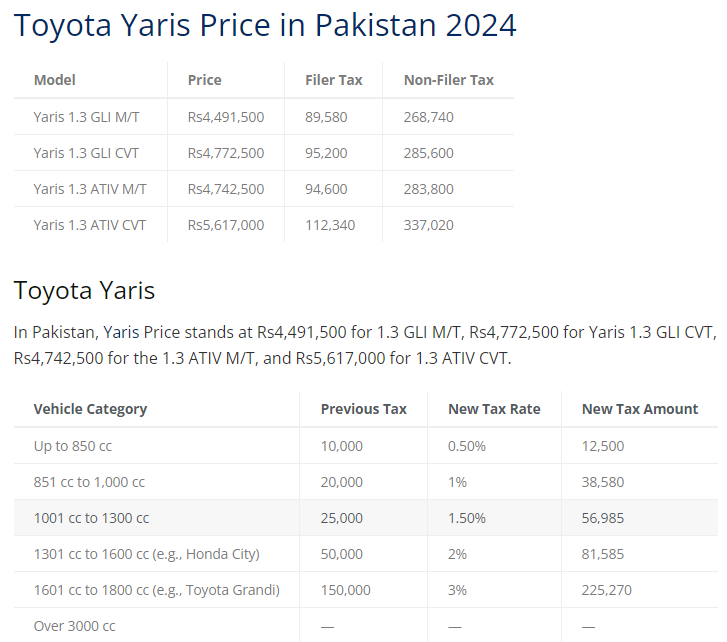 تفصیلات کے مطابق ٹیکسوں میں اضافے کا مقصد فائلرز کی حوصلہ افزائی کرنا اور نان فائلرز کیلئے مزید مشکلات کھڑی کرنا ہے تاکہ نان فائلر خود کو فائلر کے طور پر رجسٹر کروائے۔ ٹویوٹا یارس جو پاکستان میں ایک مقبول انتخاب ہے، اب 2024 ماڈلز کے لئے تازہ ترین قیمتیں یہ ہیں۔ یارس 1.3 جی ایل آئی ایم / ٹی کی نئی قیمت 4,491,500 روپے مقرر کی گئی ہے جبکہ یارس 1.3 جی ایل آئی سی وی ٹی 4,772,500 روپے، یارس 1.3 اے ٹی آئی وی ایم / ٹی4,742,500 روپے اور یارس 1.3 اے ٹی آئی وی سی وی ٹی کی نئی قیمت 5,617,000 روپے مقرر کی گئی ہے ۔