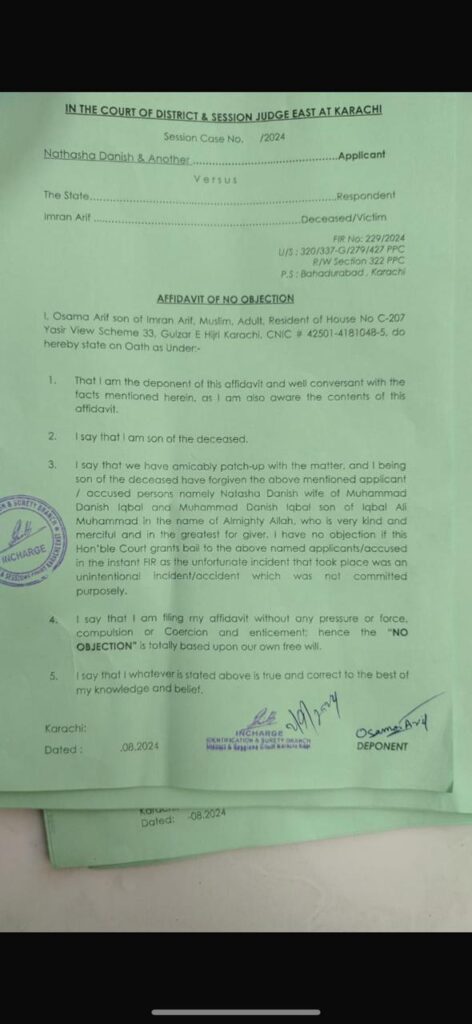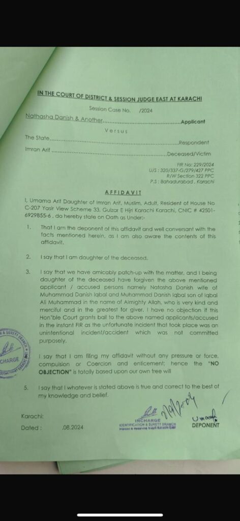 اس کے علاوہ نو ابجیکشن سرٹیفیکٹ جاں بحق ہونے عمران عارف کی اہلیہ رومانہ عمران ،بیٹے اسامہ عارف اور بیٹی عمیمعہ کی جانب سے جمع کروائی جائیں گے۔ حلف نامے کی کاپی کے مطابق ہمارے درمیان معاملات طے پا گئے ہیں، ہم نے ملزمہ کو معاف کردیا ہے، ہم نے اللہ کے نام پر معاف کیا ہے جو بڑا مہربان اور نہایت رحم والا ہے، ملزمہ کو ضمانت دینے پر ہمیں کوئی اعتراض نہیں ہے، جو حادثہ ہوا تھا وہ جان بوجھ کر نہیں کیا گیا ہے اور ہم نے بغیر کسی دبا کہ یہ نو ابجیکشن سرٹیفیکٹ دیا ہے۔ اس میں بتایا گیا ہے کہ ہم نے حلف نامے میں جو کچھ کہا ہے بالکل درست کہا ہے۔