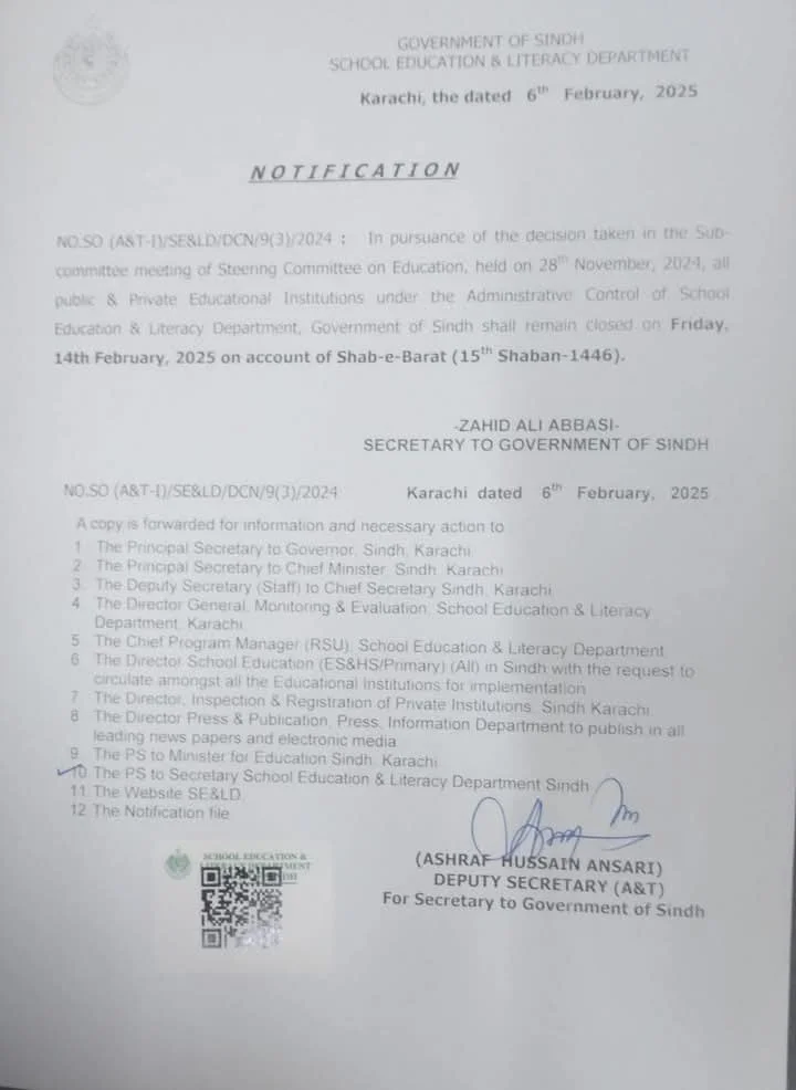 حکومتِ سندھ نے 15 شعبان شبِ برات کے موقع پر 14 فروری کو عام تعطیل کا اعلان کر دیا، جس کے تحت تمام سرکاری و نجی اسکولز اور کالجز بند رہیں گے۔ محکمہ کالج ایجوکیشن کی جانب سے باقاعدہ نوٹیفکیشن جاری کر دیا گیا ہے، جس میں واضح کیا گیا ہے کہ جمعہ کے روز سندھ بھر کے تمام تعلیمی ادارے بند رہیں گے۔