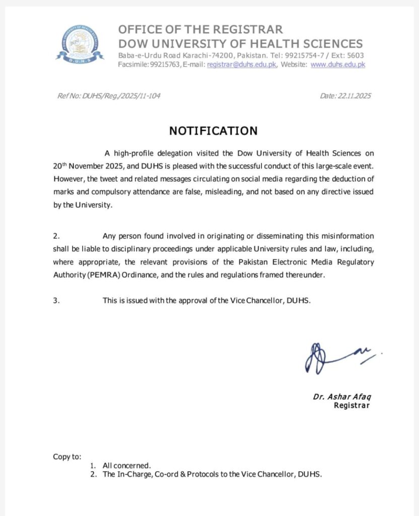 اعلامیے کے مطابق 20 نومبر 2025 کو ایک ہائی پروفائل وفد نے ڈاؤ یونیورسٹی آف ہیلتھ سائنسز کا دورہ کیا اور یونیورسٹی اس بڑے پیمانے کے ایونٹ کے کامیاب انعقاد پر خوشی کا اظہار کرتی ہے۔ اعلامیے میں کہا گیا ہے کہ سوشل میڈیا پر گردش کرنے والی وہ ٹویٹ اور پیغامات، جن میں نمبروں کی کٹوتی اور لازمی حاضری سے متعلق دعوے کیے گئے، سراسر غلط، بے بنیاد اور گمراہ کن ہیں۔ اعلامیے کے مطابق اس حوالے سے یونیورسٹی کی جانب سے کوئی ہدایت جاری نہیں کی گئی۔