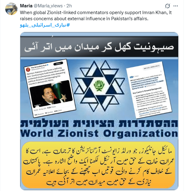 ماریہ نامی صارف نے ہیش ٹیگ کا استعمال کرتے ہوئے یروشلم کی پوسٹ اورعمران خان کا اسکرین شاٹ شیئر کیا۔ اس اسکرین شاٹ پر لکھا تھا کہ مائیکل جانکلیوز، جو کہ ورلڈ زائنسٹ آرگنائزیشن کا ترجمان ہے، کا عمران خان کے حق میں آرٹیکل لکھنا ایک واضح اشارہ ہے کہ پاکستان کے خلاف کام کرنے والی قوتیں اب چھپنے کی بجائے اعلانیہ عمران خان کے حق میں میدان میں آ گئی ہیں۔