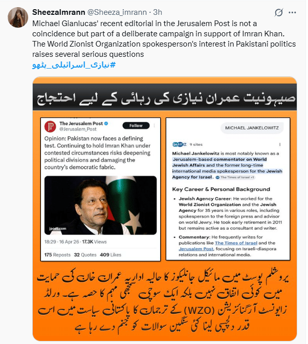 ایک اور عمیر (آزاد پنچھی) نامی صارف نے یروشلم پوسٹ اور اداریہ لکھنے والے جان لیکوز کی پروفائل کا اسکرین شاٹ شیئر کیا، جس میں درج تھا کہ ’’یروشلم پوسٹ کے ذریعے عمران خان کا بیانیہ پروموٹ کرنا اس بات کی تصدیق کرتا ہے کہ تحریک انصاف کو عالمی سطح پر کس قسم کی طاقتوں کی پشت پناہی حاصل ہے، صہیونیوں کے ترجمان کا عمران خان نیازی کے حق میں ‘انسانی حقوق’ کا راگ الاپنا ایک بڑا دھوکہ اور عالمی سازش کا شاخسانہ ہے۔‘‘