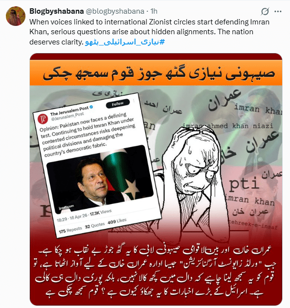 ایک اور صارف بلاگ بائے شبانہ نے اسکرین شاٹ شیئر کیا جس پر درج عبارت تھی ’’ صہیونی نیازی گٹھ جوڑ قوم سمجھ چکی ہے، عمران خان اور بین الاقوامی صہیونی لابی کا یہ گٹھ جوڑ بے نقاب ہو چکا ہے۔ جب ’ورلڈ زائنسٹ آرگنائزیشن‘ جیسا ادارہ عمران خان کے حق میں آواز اٹھاتا ہے، تو قوم کو یہ سمجھ لینا چاہیے کہ دال میں کچھ کالا نہیں بلکہ پوری دال ہی کالی ہے۔ اسرائیل کے بڑے اخبارات کا یہ جھکاؤ کیوں؟ قوم سمجھ چکی ہے۔‘‘