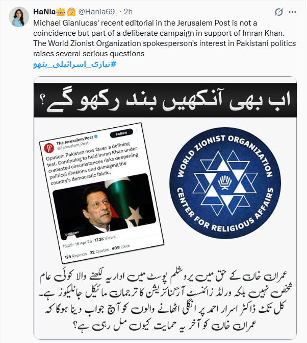 Michael Gianlucas’ recent editorial in the Jerusalem Post is not a coincidence but part of a deliberate campaign in support of Imran Khan. The World Zionist Organization spokesperson’s interest in Pakistani politics raises several serious questions#نیازی_اسرائیلی_پٹھو pic.twitter.com/LwXEJZ05Tf