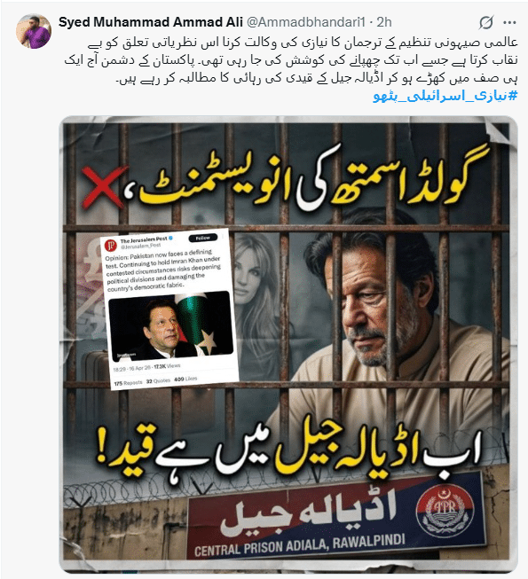 ایک اور صارف سید محمد عماد علی نے اسکرین شاٹ شیئر کیا جس پر درج عبارت تھی:گولڈ اسمتھ کی انویسمنٹ، اب اڈیالہ جیل میں ہے قید! عماد نے اپنے پوسٹ پر ردعمل دیتے ہوئے کہاکہ عالمی صیہونی تنظیم کے ترجمان کا نیازی کی وکالت کرنا اس نظریاتی تعلق کو بے نقاب کرتا ہے جسے اب تک چھپانے کی کوشش کی جا رہی تھی۔ پاکستان کے دشمن آج ایک ہی صف میں کھڑے ہو کر اڈیالہ جیل کے قیدی کی رہائی کا مطالبہ کر رہے ہیں۔