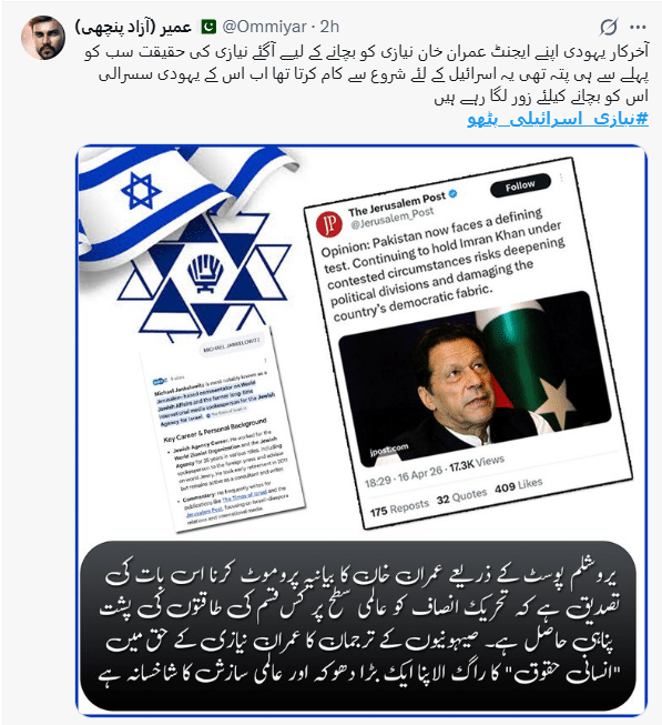 سماجی رابطوں کی ویب سائٹ ایکس (سابقہ ٹویٹر) پر ہیش ٹیگ ’’نیازی اسرائیلی پٹھو‘‘ تیزی کے ساتھ ٹرینڈ کر رہا ہے، جس کی ابتدا گزشتہ روز یروشلم پوسٹ میں عمران خان کے حق میں شائع ہونے والی ایک پوسٹ سے ہوئی۔