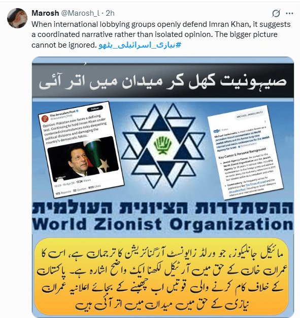 ماہ روش نامی صارف نے ہیش ٹیگ کا استعمال کرتے ہوئے ایک اسکرین شاٹ شیئر کیا جس پر درج ہےکہ ’’صہونیت کھل کر میدان میں اُتر آئی، مائیکل جانلکیوز جو ورلڈ زائنسٹ آرگنائزیشن کا ترجمان ہے، اس کا عمران خان کے حق میں آرٹیکل لکھنا ایک واضح اشارہ ہے۔ پاکستان کے خلاف کام کرنے والی قوتیں اب عمران خان کے لیے میدان میں اُتر آئی ہیں۔‘‘