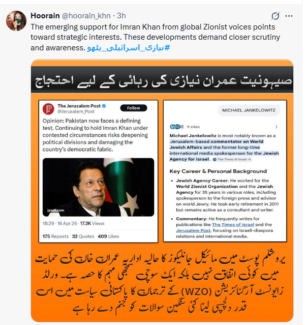 ہورین نامی صارف نے یروشلم پوسٹ اور مائیکل جانلکیوزکی پروفائل کا اسکرین شاٹ شیئر کرتے ہوئے لکھا کہ ’’عمران خان کے حق میں عالمی صیہونی آوازوں کی ابھرتی ہوئی حمایت حکمت عملی کے مفادات کی طرف اشارہ کرتی ہے۔ ان ترقیات کو مزید قریب سے دیکھنے اور آگاہی کی ضرورت ہے۔‘‘