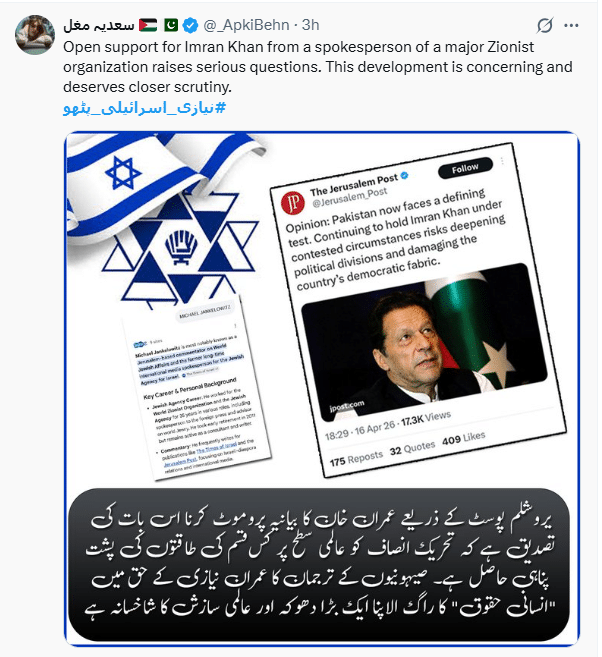 صارف نے یروشلم کی پوسٹ پر اپنے ردعمل میں کہاکہ جب عالمی صیہونی حلقوں سے جڑی آوازیں عمران خان کا دفاع کرنا شروع کر دیتی ہیں تو مخفی اتحاد کے بارے میں سنگین سوالات اٹھتے ہیں۔ قوم کو وضاحت کی ضرورت ہے۔