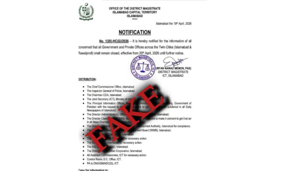 اسلام آباد اور راولپنڈی (جڑواں شہروں) میں 20 اپریل کو چھٹی اور دفاتر بند ہونے سے متعلق ایک جعلی نوٹیفکیشن سوشل میڈیا پر وائرل ہو گیا، جس پر ضلعی انتظامیہ نے فوری ردعمل دیتے ہوئے اسے بے بنیاد اور جعلی قرار دے دیا ہے۔