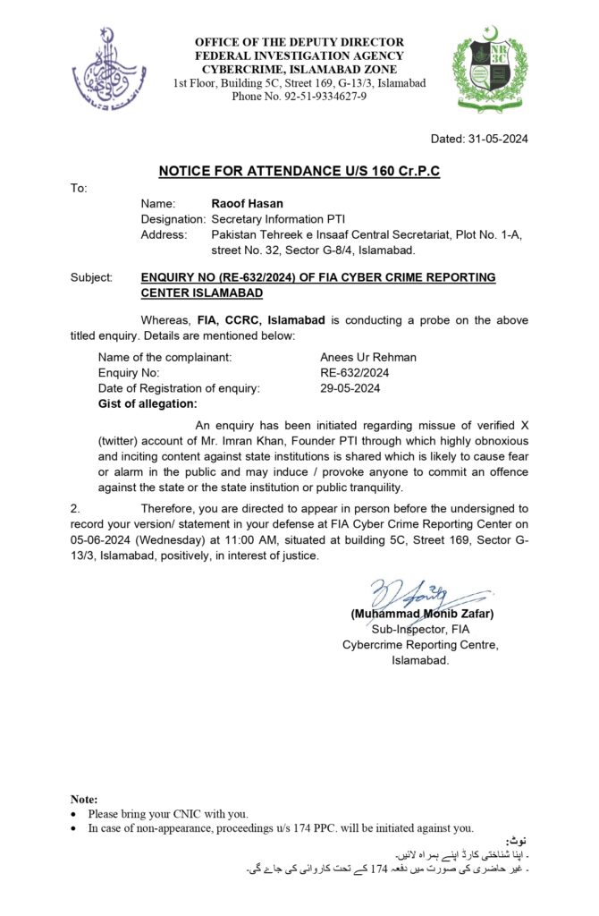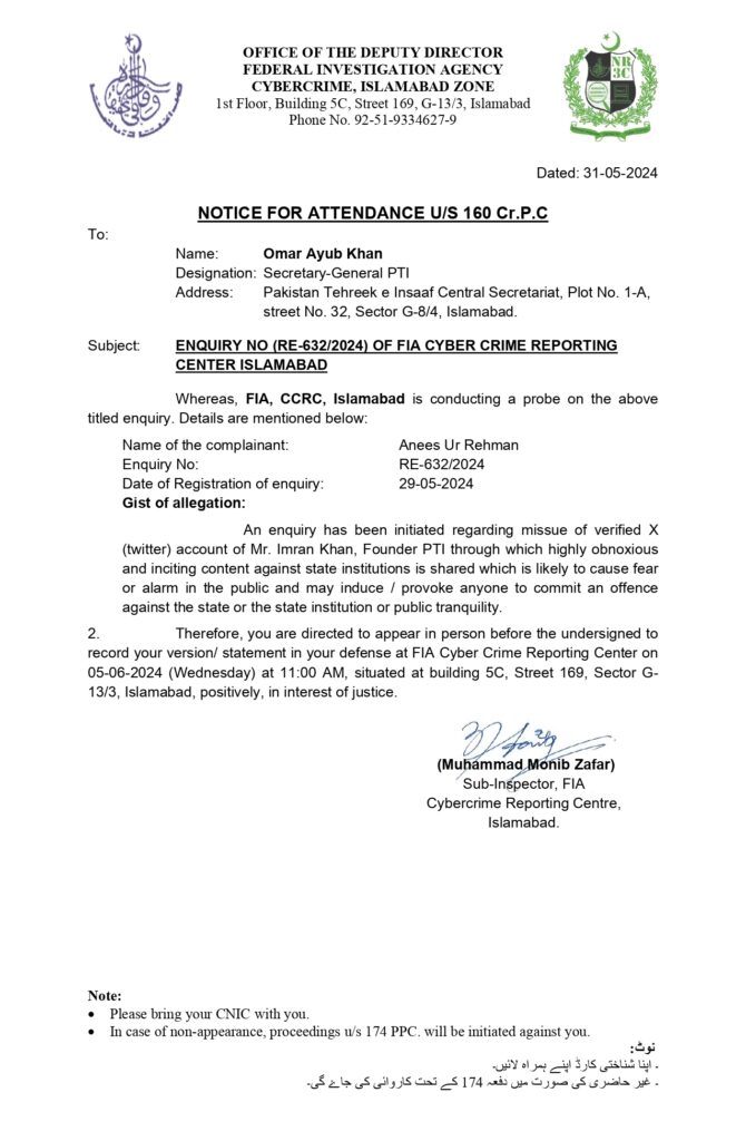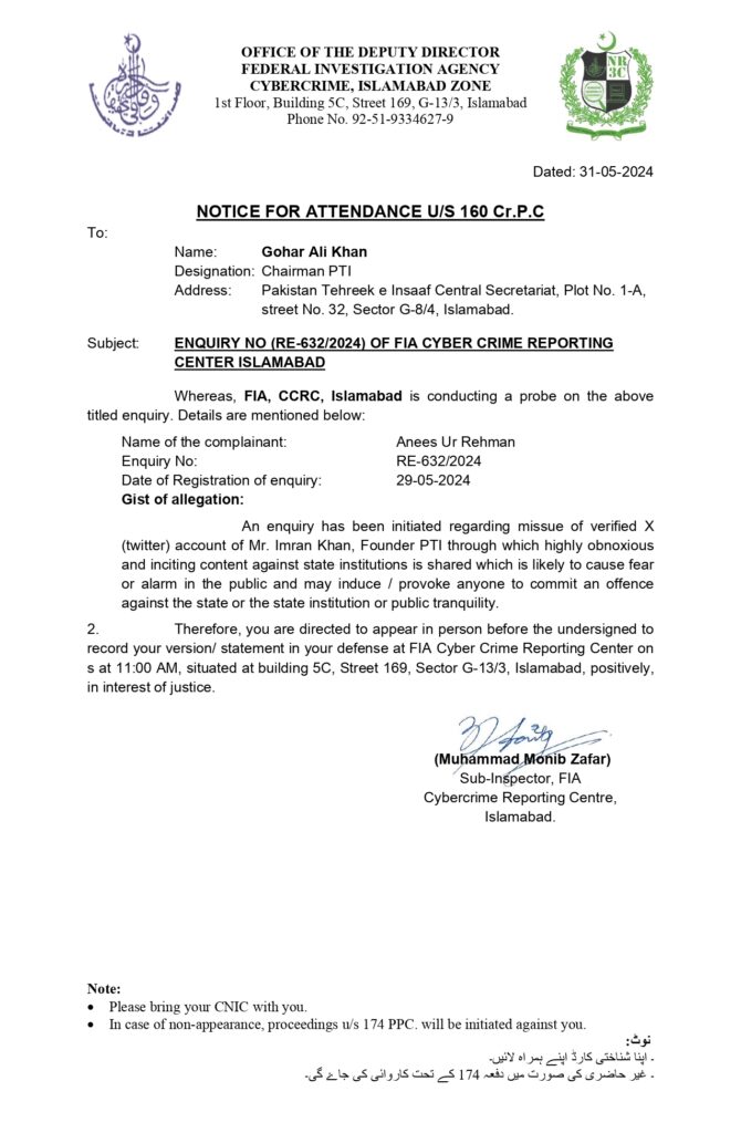 ایف آئی اے نوٹس کے نوٹ میں تحریر ہے کہ غیر حاضری کی صورت میں متعلقہ فریق کیخلاف پاکستان پینل کوڈ دفعہ 174 کے تحت کاروائی کی جائے گی۔