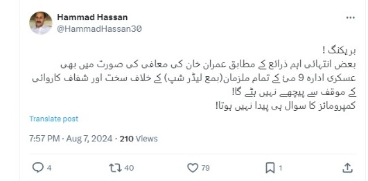 صحافی حماد حسن نے سوشل میڈیا پلیٹ فارم ایکس ’ٹویٹر‘پر ایک ٹویٹ میں کہا کہ ’بعض انتہائی اہم ذرائع کے مطابق عمران خان کی معافی کی صورت میں بھی عسکری ادارہ 9 مئ کے تمام ملزمان(بمع لیڈر شپ) کے خلاف سخت اور شفاف کاروائی کے موقف سے پیچھے نہیں ہٹے گا، کمپرومائز کا سوال ہی پیدا نہیں ہوتا‘