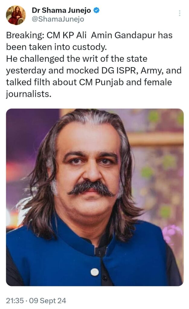 خاتون صحافی نے سوشل میڈیا پلیٹ فارم ایکس پر ٹویٹ کی کہ ’’وزیراعلیٰ خیبرپختونخوا علی امین گنڈاپور کو تحویل میں لے لیا گیا ہے۔ گزشتہ روز انہوں نے ریاستی آئینی اختیارات کو چیلنج کیا اور ڈی جی آئی ایس پی آر، فوج، وزیراعلیٰ پنجاب اور خواتین صحافیوں کے بارے میں توہین آمیز بیان دیا۔‘‘