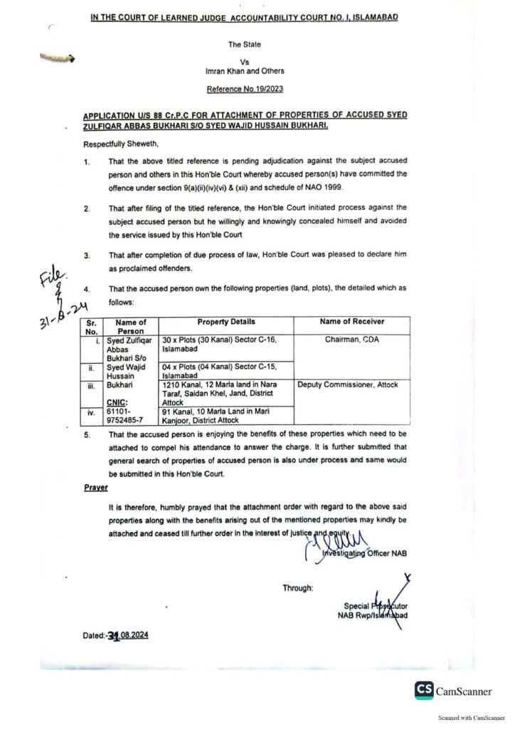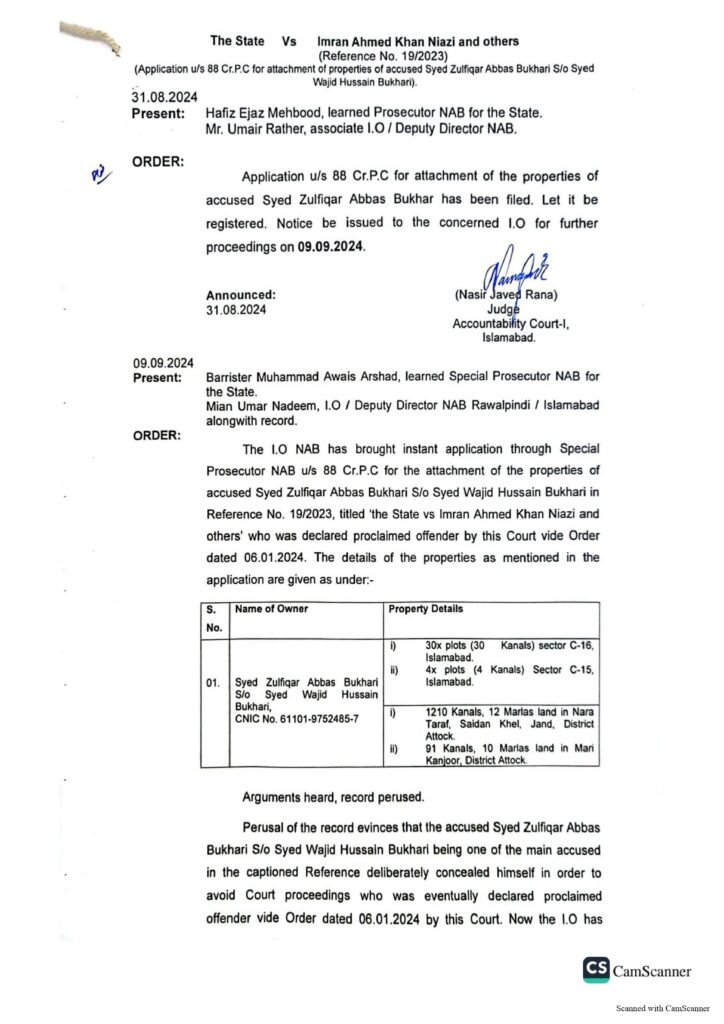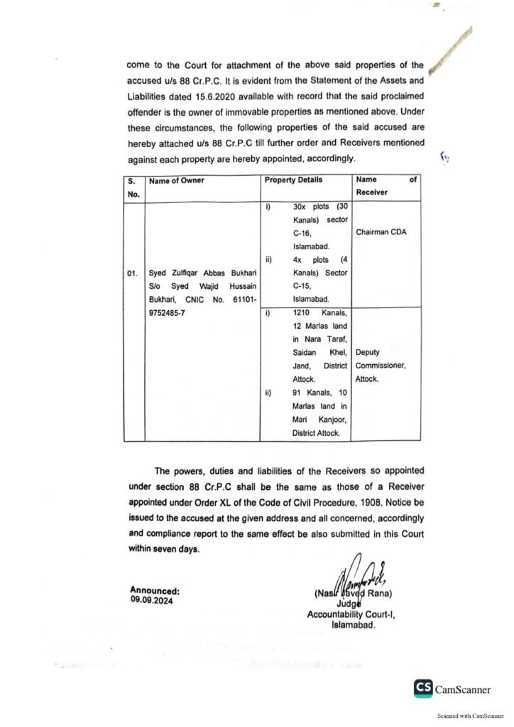 اس کے علاوہ زلفی بخاری کی ضلع اٹک میں واقع 1210 کنال 12 مرلہ پراپرٹی میں سے 91 کنال 10 مرلہ زمین بھی ضبط کرنے کی ہدایت دی گئی ۔