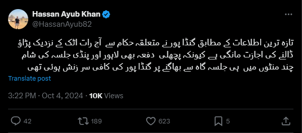 صحافی حسن ایوب نے سوشل میڈیا پلیٹ فارم ایکس پر ٹویٹ میں لکھا کہ ’’تازہ ترین اطلاعات کے مطابق گنڈا پور نے متعلقہ حکام سے آج رات اٹک کے نزدیک پڑاؤ ڈالنے کی اجازت مانگی ہے کیونکہ پچھلی دفعہ بھی لاہور اور پنڈی جلسہ کی شام چند منٹوں میں ہی جلسہ گاہ سے بھاگنے پر گنڈا پور کی کافی سر زنش ہوئی تھی۔‘‘