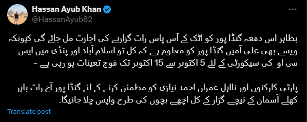 انہوں نے ایک اور ٹویٹ میں لکھا کہ ’’بظاہر اس دفعہ گنڈا پور کو اٹک کے آس پاس رات گزارنے کی اجازت مل جائے گی کیونکہ ویسے بھی علی امین گنڈا پور کو معلوم ہے کہ کل تو اسلام آباد اور پنڈی میں ایس سی او کی سیکورٹی کے لئے 5 اکتوبر سے 17 اکتوبر تک فوج تعینات ہو رہی ہے ۔پارٹی کارکنوں اور نااہل عمران احمد نیازی کو مطمئن کرنے کے لئے گنڈا پور آج رات باہر کھلے آسمان کے نیچے گزار کے کل اچھے بچوں کی طرح واپس چلا جائیگا۔