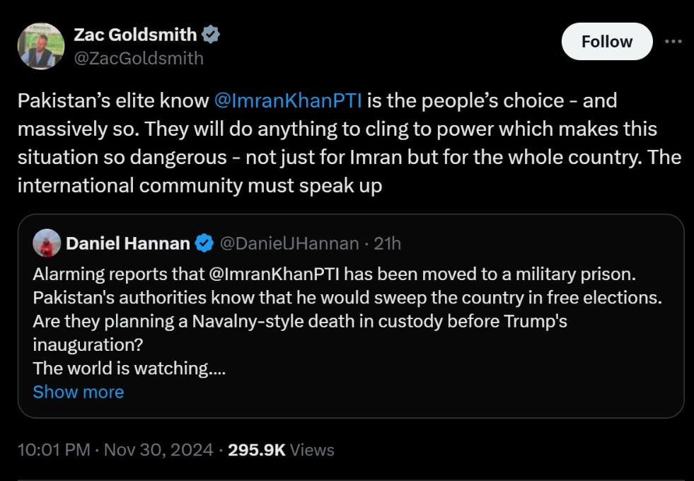 انہوں نے اپنے ایکس اکاؤنٹ (سابقہ ٹوئٹر) پر اس معاملے پر عالمی توجہ مرکوز کرانے کی کوشش کی۔ زیک گولڈ اسمتھ نے کہا کہ پاکستانی اشرافیہ اچھی طرح جانتی ہے کہ اڈیالہ جیل میں قید عمران خان پاکستانی عوام کے پسندیدہ لیڈر ہیں۔