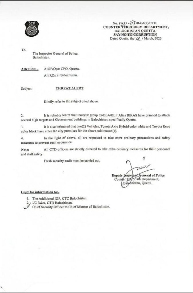 سی ٹی ڈی نے بتایا کہ 2 گاڑیاں کوئٹہ میں داخل ہوچکی ہیں، جو کہ سرکاری دفاتر یا ہائی آفیشلز پر حملہ کر سکتی ہیں۔ مراسلے میں کہا گیا ہے کہ پولیس کو عوام اور سرکاری املاک کے تحفظ کے لیے مزید اقدامات اٹھائے۔
