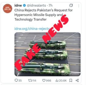 آزاد فیکٹ چیک نے بھارت سے منسلک ایک ایکس ہینڈل کے ذریعے پھیلائی جانے والی جعلی خبروں کی نشاندہی کی ہے جس میں دعویٰ کیا گیا ہے کہ چین نے ہائپرسونک میزائل کے لیے پاکستان کی درخواست کو مسترد کر دیا ہے۔