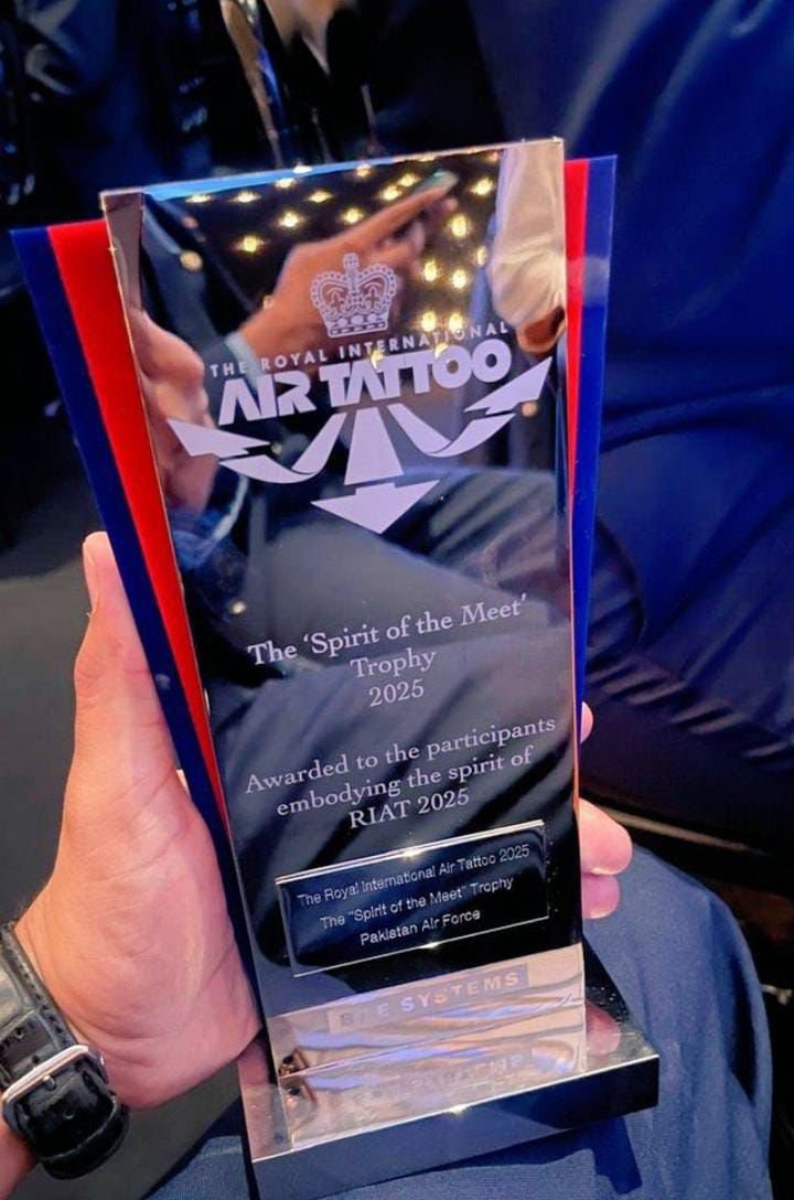 آئی ایس پی آر کے مطابق پاک فضائیہ کے جدید ترین JF-17 تھنڈر بلاک-III لڑاکا طیارے نے RIAT کا سب سے بڑا اعزاز “Spirit of the Meet” حاصل کیا۔ یہ ایوارڈ بہترین کارکردگی، جدید ٹیکنالوجی اور منفرد فضائی مظاہرے پر دیا جاتا ہے۔ قابلِ ذکر بات یہ ہے کہ یہ طیارہ پاکستان سے برطانیہ تک بغیر رکے ایئر ٹو ایئر ری فیولنگ (AAR) کے ذریعے پہنچا، جس نے نہ صرف تکنیکی صلاحیتوں کا بھرپور مظاہرہ کیا بلکہ اپنی دلکش اسکیم اور انٹری سے بین الاقوامی جیوری اور ماہرین کو بھی متاثر کیا۔
