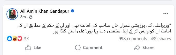 علی امین گنڈا پور نے کہا ہے کہ “وزیراعلی کی پوزیشن عمران خان صاحب کی امانت تھی اور ان کے حکم کے مطابق ان کی امانت ان کو واپس کر کے اپنا استعفی دے رہا ہوں”
