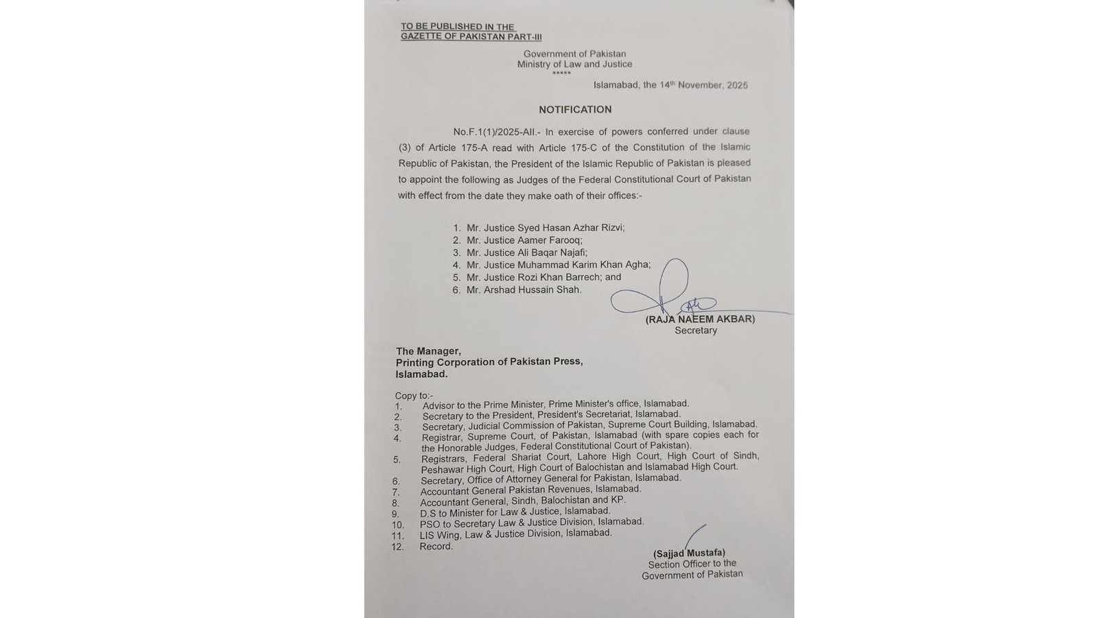 نوٹیفکیشن کی کاپیاں وزیرِ اعظم کے مشیر، صدر کے سیکر ٹری، جوڈیشل کمیشن، سپریم کورٹ کے رجسٹرار اور چاروں ہائی کورٹس سمیت مختلف سرکاری اداروں کو بھجوا دی گئی ہیں تاکہ انتظامی طور پر تمام تقرریوں کو مکمل کیا جاسکے۔