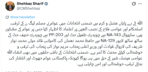 ضمنی انتخابات کے باقی حلقوں میں بھی انشاء اللہ عوامی فیصلہ شیر کے حق میں ہی ہوگا کیونکہ پاکستانی عوام جھوٹ اور انتشار کی بجائے ترقی، خوشحالی اور امن چاہتی ہے۔